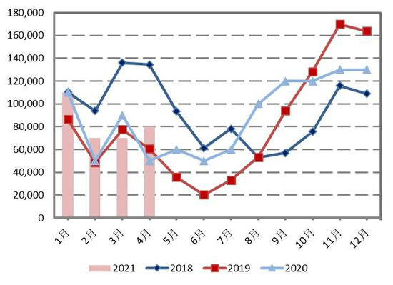 我国鲜苹果主要出口孟加拉国、越南、泰国等东南亚国家。一方面,海外疫情没有全面好转,尤其是印度疫情严重爆发,或会对其它东南亚国家造成影响,拖慢海外消费市场的恢复;另一方面,人民币升值也不利于出口。我国鲜苹果胜在产量丰富,相对来说价格比较低廉,再加上产区跌价清库,导致苹果价格较前期下滑明显,对出口形成了一定程度的利好支撑,预计5月的出口数据将延续4月份的出口表现,但从季节性上来看,6、7月苹果的出口数量位于全年的相对低位,因此预计今年6月份出口量环比略回落。