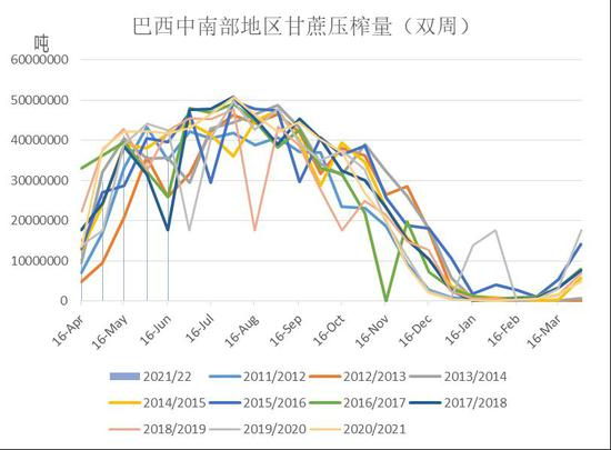 UINCA公布的数据显示,2021年6月上半月巴西中南部地区糖厂压榨3590万吨,同比减少14%,产糖量219万吨,同比减少14%,乙醇产量同比下降8.7%至16.8亿升。糖厂使用46.2%的甘蔗产糖,同比下降0.8个百分点。截至6月中旬,巴西中南部累计甘蔗压榨16543.8万吨,产糖934.2万吨,同比减少12%,累计乙醇产量38.36亿公升,同比降13.17%,平均制糖比例为44.47%,上一榨季同期为45.19%。整体UINCA公布的数据偏多,低于市场预估。