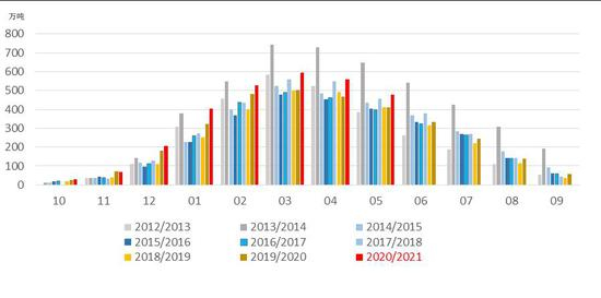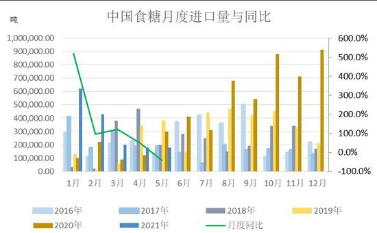 泰国2021年3、4、5月分别出口糖36.3万吨、25.69万吨、36.47万吨,同比减少65.56%,2020年10月至2021年5月累计出口糖234.25万吨,同比减少62.8%。