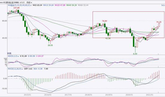 6月国际原油价格继续上涨,并加速波动,WTI原油主力合约价格6月25日收盘报收74美元/桶,较5月底收盘价上涨7.37美元,涨幅达11.06%,表现缩量减仓态势。