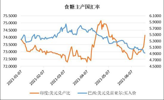 6月,美元指数价格反弹运行,截至6月25日收盘,美元指数收91.810,月涨幅2.19%。巴西雷亚尔升值运行,6月25日雷亚尔汇率报4.92,月升值2.2%。6月18日,美元兑印度卢比报74.1442,月内大幅度贬值。主产国汇率处升值,不利于出口,对国际糖市的供应缩减有利,利于国际糖价反弹上涨。中国人民币汇率截至6月25日,1美元兑人民币为6.4744,人民币相对上月升值1.66%。