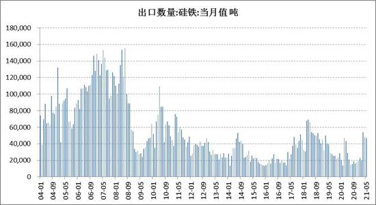 2021年5月中国含硅量大于55%硅铁出口量为45184.62吨,环比上月减少1172.31吨,降幅为2.53%;较去年同期增加17396.99吨,增幅62.61%。未来,海外市场钢铁产量逐步回升,在海外市场价格更高情况下,国内硅铁出口优势明显,下半年出口预计有部分增量。