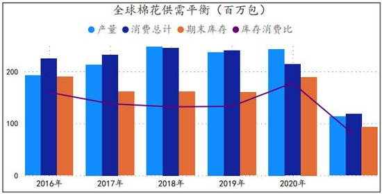 图1:全球棉花供需平衡走势图 单位:百万包