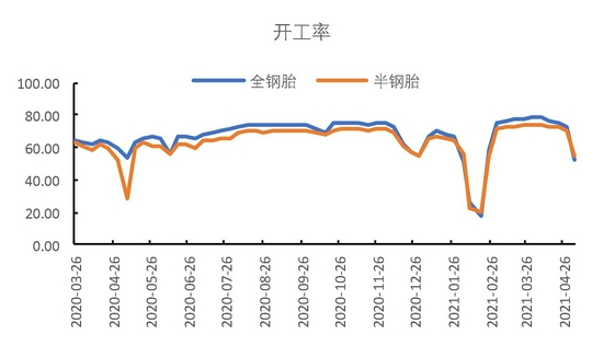 自五一假期结束后,国内轮胎开工便下降至低位;进入夏季,轮胎市场仍无明显好转,替换、配套、出口三大市场缺乏明显好转迹象令轮胎整体开工依旧维持在60%附近。替换市场方面,终端市场整体表现较为疲弱,市场整体走货情况不佳;配套市场方面,国内汽车产销连续5个月下降,7月汽车产销更是进入同比下降状态,轮胎需求表现难以获得明显提振;出口市场方面,尽管订单表现尚可,但由于海运费高企且低价货柜资源仍然紧张,轮胎出口亦受到一定阻碍。在出货及库存双重压力影响下,近期轮胎企业开工预计将继续维持低位,短期内或存在再度下降可能。截至8月26日当周,国内全钢胎周度开工负荷为55.58%,环比前一周下降5.75个百分点,较2020年同期下降18.91个百分点;半钢胎周度开工负荷为57.7%,环比前一周微增0.4个百分点,较2020年同期下降12.02个百分点。