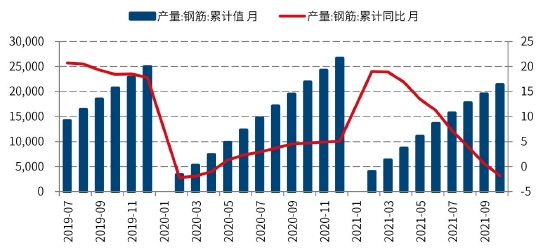 锰硅需求主要在炼钢行业,也有小部分用于铸造等。而炼钢行业中,锰硅用量最大的品种是钢筋,也就是我们经常说的螺纹钢。2021年1-10月我国钢筋产量累计21412万吨,同比减少1.8%;产量上半年大幅增长,但下半年受到政策限产影响大幅回落,其中7月产量2101万吨,同比减少12.5%;8月产量继续减少至2012万吨,同比减少16.1%;9月产量1769万吨,同比减少24.7%;10月产量1892万吨,同比减少20.6%。