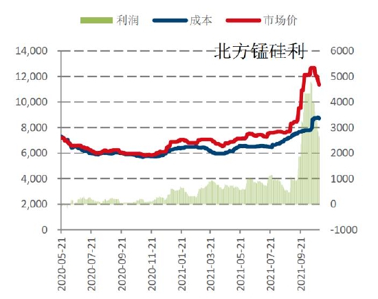今年硅铁生产总体利润较好,多数时间用电网电生产有千元左右利润,这也导致了8月前硅铁产区即使屡次受到限电影响,但生产仍然保持了增长,在限电严重的9月底硅铁生产利润甚至接近万元。我们用硅铁自备电厂的生产为低值成本,峰值电费的生产为高值成本。过去几年硅铁价格多数处于高值成本和低值成本之间震荡,但是5月之后随着动力煤价格的暴涨,高低值利润出现扭转,峰电电费的生产成本反而远低于动力煤自产电的生产成本。随着10月硅铁价格的下跌,利润出现明显回落。10月硅铁成本出现较大变化,一方面动力煤冲高回落,一方面电费在10月中旬以后陆续开始抬升,硅铁部分地区成本突破万元,高利润不再,但自产成本在10月末随着动力煤的回落也逐渐下落。11月以后煤炭价格回归理性,电费回升,导致高低值利润回归常态。