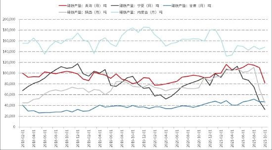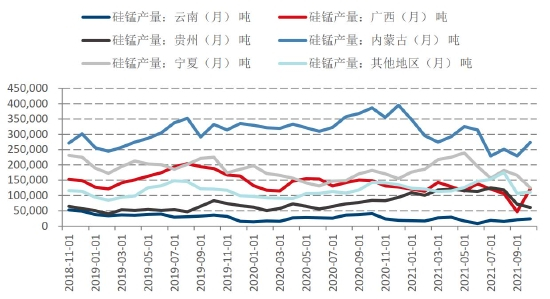 从分省产量来看略短周期的硅铁数据来看,3月内蒙能耗双控,因为内蒙以季度为考核目标,因此3月后硅铁内蒙产量明显回落,随后低位徘徊,宁夏在6月前一直处于产量扩张之中,7月开始抓能耗双控,导致7月以后产量明显减少。其余地区在9月后出现明显减产,10月减幅更大,总的来看1-8月硅铁产量还处于比较大的扩张之中,9、10月硅铁产量随着电力紧张产量大幅回落,预计11月随着电力缓解产量将有所恢复。
