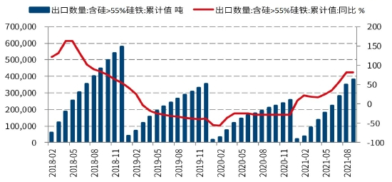2021年硅铁出口明显上升,2021年初出口征税下调为20%,5月回升到25%。海外需求复苏导致硅铁出口大幅好转,根据海关数据,1-9月55%以上含硅量的硅铁出口38.2万吨,同比增加82.29%。硅铁出口需求的增长是硅铁价格前期走强的一块重要拼图。由于硅铁多为厂对厂销售,下游提前招标,上游订单生产,因此硅铁厂富余的产量多为出口销售以及卖给国内贸易商做仓单。硅铁9月前出口大增消耗了相当部分今年的富余产能。但9月底之后随着现货价格跳涨,硅铁出口价格飙升,预计会导致10月出口的受限。