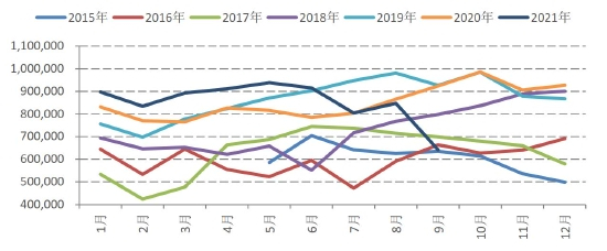 锰矿进口量总体处于偏低水平,但由于锰硅生产减少,锰矿进口并未成为市场的关键点和瓶颈所在。根据统计局数据,2021年1-9月锰矿进口量2306万吨,同比增加3.7%,增幅明显减少。7月进口量为274万吨,8月进口量大幅减少至222.6万吨,9月进口量为221.0万吨。我们认为锰矿进口量在280万吨为供需平衡点,则锰矿进口在7月前趋于供需平衡,但8、9月低于供需平衡位置。