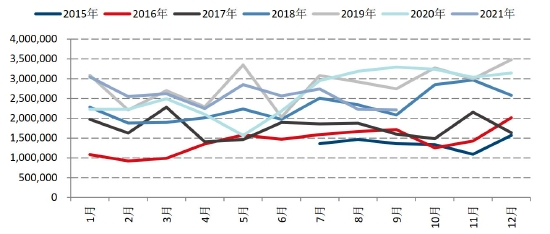硅铁最大的需求在钢材端。2021年钢材产量前高后低,1-6月大幅增产,7、8、9、10月钢材出现明显减产,据国家统计局数据显示,2021年10月份,我国粗钢产量7158万吨,同比下降23.3%;10月份全国粗钢日均产量230.9万吨,环比下降6.1%;1-10月,我国粗钢产量87705万吨,同比下降0.7%。2021年10月份,我国生铁产量6303万吨,同比下降19.4%;10月份生铁日均产量203.3万吨,环比下降6.4%;1-10月,我国生铁产量73407万吨,同比下降3.2%。2021年10月份,我国钢材产量10174万吨,同比下降14.9%;10月份钢材日均产量328.2万吨,环比下降3.4%;1-10月,我国钢材产量112235万吨,同比增长2.8%。