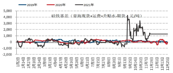 硅铁现货价格2021年9月前跟随期货震荡走高,但涨幅一直不及期货,导致2021年11月中旬以前相当长的时间(46%的时间)硅铁的买现货抛期货的盈利窗口是打开的,有时候盈利窗口甚至超过700元/吨。我们认为,长期期货期现套利盈利,是因为资金比较看多硅铁导致的;而盈利的本身可以导致期现贸易商的扩张,进行买现货抛期货的操作,把现货做成库存,也导致现货的紧张程度加剧。