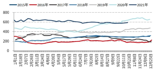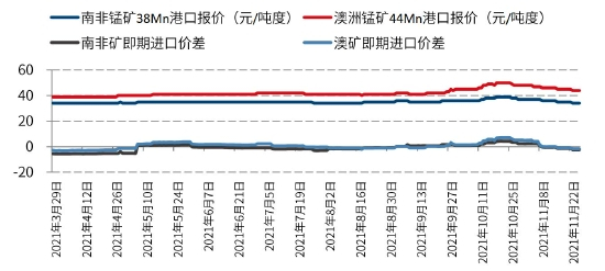 锰矿港口库存过剩明显减少,今年锰矿出现了明显去库存,9、10月即使锰硅产量骤然减少,锰矿库存也没有出现明显累积。根据上海钢联的数据,截止2021年11月19日锰矿钦州港和天津港库存合计583.6万吨,同比下降12.8%。