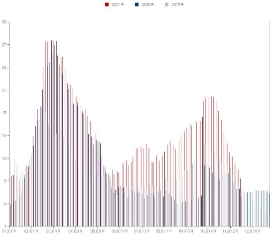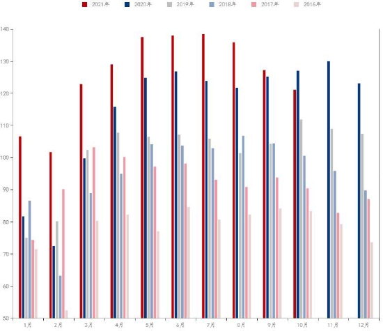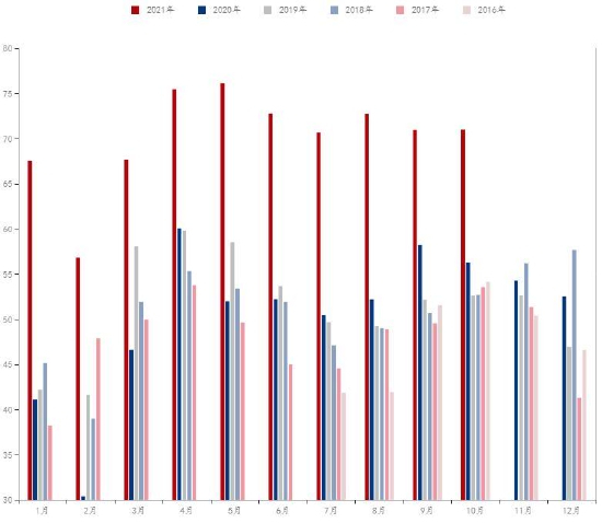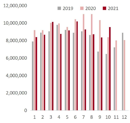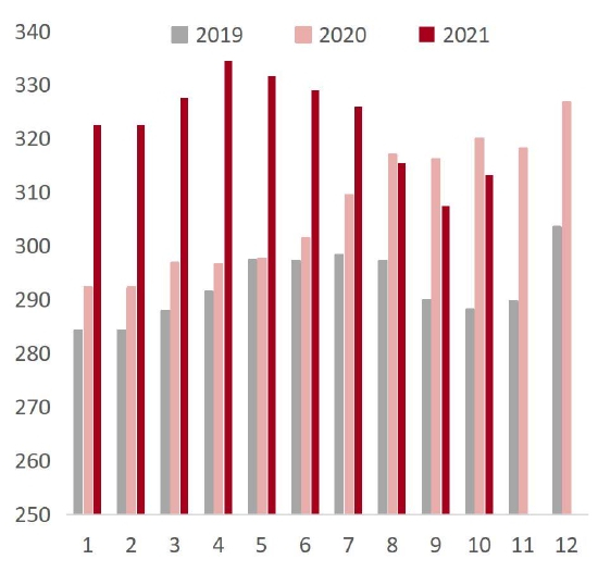 1-10月我国铝棒累计产量1258.35万吨,同比增12.43%。增速和去年基本持平,高于2019年的6.7%的增速,下游挤压材需求仍保持较快增长。从产量看,铝棒产量也经历了前高后低的走势,显示出下游在三季度受限电影响,产量出现下滑。