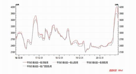 1-10月中国氧化铝产量同比增7.9%,增速较快。氧化铝价格也出现了较快上涨,最高超过4000元/吨,也是近些年以来的高价。价格上涨主要受到铝价处于高位,氧化铝受限电影响产量大幅回落,供应减少价格涨速加快。