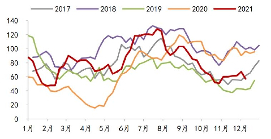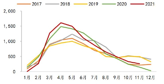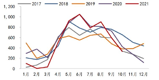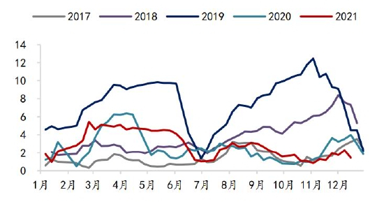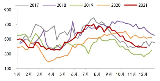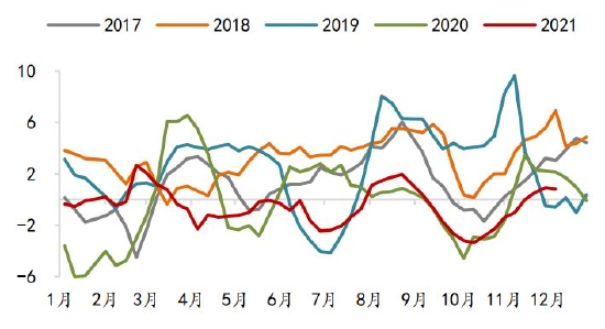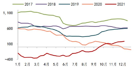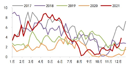 蛋鸡方面,2021年在产蛋鸡存栏持续处于近几年同期低位,而随着蛋鸡养殖预期盈利的回升,从5月份开始育雏鸡当月补栏量同比几乎均为正。根据蛋鸡生产周期,按当月存栏量=上月存栏量+前4个月补栏量-前16个月补栏量粗略计算,预计在产蛋鸡存栏量同比从2022年3月份开始转正。
