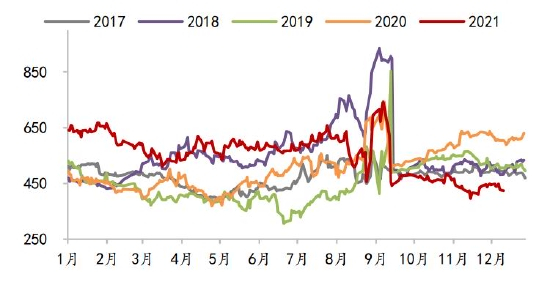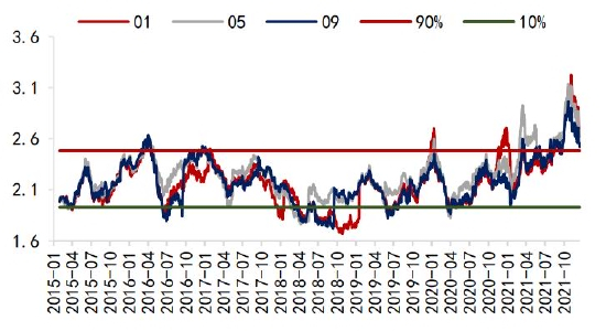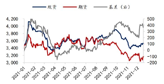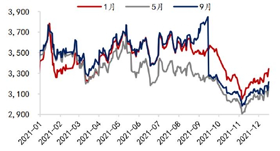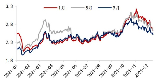 油粕比方面,受棕榈油及菜籽油带动,2021年豆油价格创近十年新高,01合约油粕比最高触及3.22。展望2022年,宏观面,美联储已宣布加速Taper,预计2022年3月结束购债,美国通胀担忧加剧,明年加息预期较强,美元走强,流动性逐渐收紧。国内加强对大宗商品价格管理调控,资金风险偏好降低,油脂高位不胜寒。基本面,马来西亚全面放开外籍劳工入境,拉尼娜带来的强降雨虽然会造成当期产量下降,但有利于明年棕榈油产量增加,而豆油上游大豆供给预期增加,国内抛储传闻接连不断。需求方面,预计生柴政策继续利多有限,因此基本面存累库预期。目前油粕比主要驱动在于油脂端,预计2022年油脂或现拐点,油粕比将高位回落,建议空单长期持有。