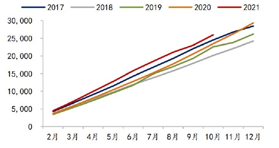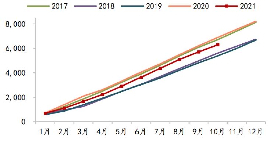 图40 豆粕月度表观消费累计值(万吨)