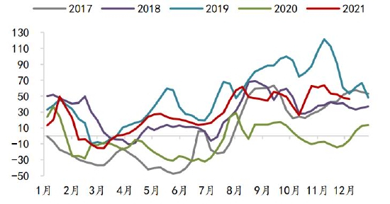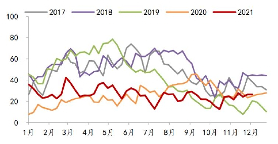 图5 2021年豆粕基差走势(元/吨)