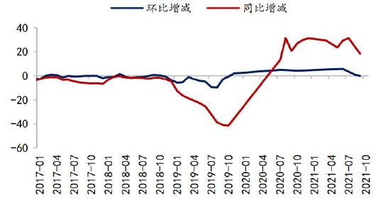 饲料需求占豆粕总消费的98%以上,据饲料工业协会统计,2021年1-11月全国饲料累计产量同比增加13.8%,其中猪饲料、蛋禽饲料和肉禽饲料同比分别为44.9%、-9.2%和-5.9%,三者占饲料总产量比例分别为43.8%、10.8%和30.6%。生猪存栏完全恢复,猪饲料产量同比大增是饲料整体增长的主要原因。但据统计2021年1-10月豆粕表观消费量却表现为同比下降,究其原因主要是能量饲料玉米成本过高,玉米-小麦价差拉大后,含蛋白量更高的小麦对玉米产生了替代,从而减少了蛋白饲料豆粕的添加比例。接下来从养殖存栏以及饲料配方调整两方面来分析预测2022年豆粕的需求。