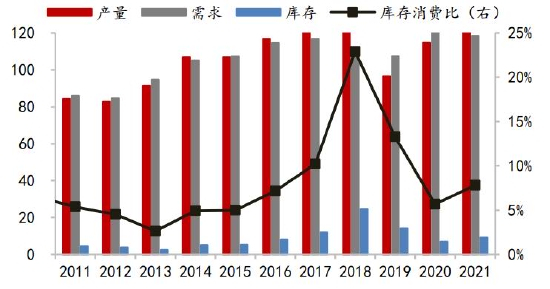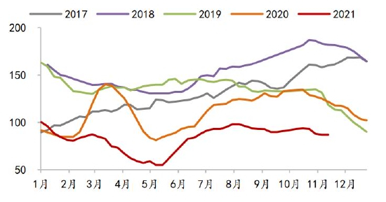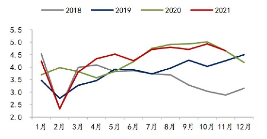 肉鸡方面,卓创资讯数据,2021年1-11月全国肉鸡出栏量47.31亿只,同比下降0.11%。目前主产区肉鸡苗价格降至近五年同期低位,一定程度上刺激了补栏热情,但考虑猪肉价格2022年或仍在底部震荡,鸡肉价格亦难有大涨,预计2022年肉鸡出存栏量变动有限,按正常年份禽肉产量测算,同比变动或在2%以内。