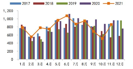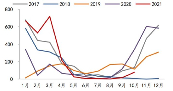 图21 我国进口大豆月度到港量(万吨)