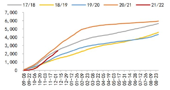 阿根廷大豆方面,通常受拉尼娜影响减产的概率要大于巴西,近11个年度发生的5次拉尼娜事件里有4次阿根廷大豆单产出现同比下滑,其中就包括2020年度。2021年度开始阿根廷产区依旧存干旱担忧,不过2021年11、12月产区降雨量高于上年同期,因此主产区土壤墒情优于上年,截至2021年12月8日,阿根廷大豆种植率56.1%,去年同期57.1%。USDA预计21/22年度阿根廷大豆单产增面积降,产量则同比增330万吨至4950万吨。2021年度阿根廷产量同比增长为大概率事件,但能否达到USDA的预测值,还需关注2022年1月份产区降雨量后确定,若产区降雨依旧不足,不排除产量下调可能。