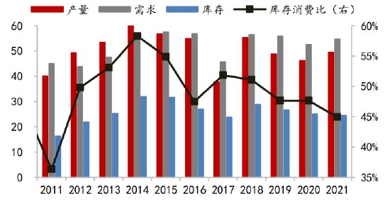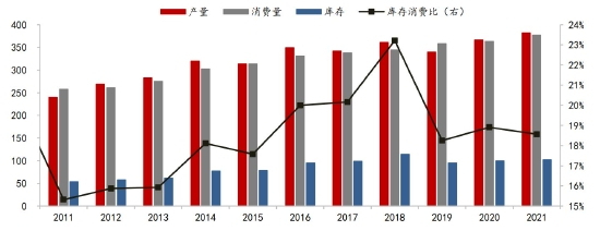 生猪方面,官方数据,2021年10月末,我国能繁母猪存栏4348万头,同比增长6.6%,存栏绝对量已超非瘟前2017年的水平,相当于正常保有量的106%。由于供给端超预期恢复,2021年年初开始猪价高位回落,养殖利润在二季度进入全面亏损,7月份能繁母猪存栏量开始环比转跌。从生产周期看,能繁母猪存栏量决定了10个月以后的商品猪供给,对应生猪出栏量高点在2022年二季度,届时猪价大概率再次探底,因此淘汰低效产能会是2022年生猪养殖的主基调。按供需平衡测算,母猪存栏量仍有6%的调降空间,对应4100万头存栏量,生猪存栏则对应在39000万头左右,较2021年三季度末43764万头降幅为11%。