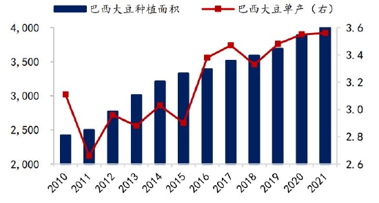 图14 巴西大豆面积及单产(百万公顷,吨/公顷)