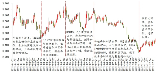 2021年前三季度豆粕在区间高位震荡,四季度破位下行。不同于油脂受宏观及资金因素干扰较多,豆粕则主要由基本面引导,美国大豆低库存消费比奠定了行情全年在高位运行的基础,阶段性行情则分别围绕南美天气、非瘟疫情、美国大豆种植面积以及产区天气和油粕比展开。在新作美豆天气炒作落空,21/22年度期末库存消费比不断上调后,四季度连粕低开转熊。不过受油粕比回落以及阿根廷产区干旱担忧影响,11月上旬连粕开启了一波反弹趋势。