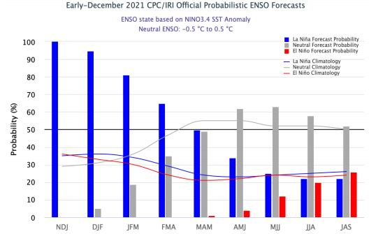 巴西大豆方面,2021年10月NOAA宣布拉尼娜现象已经出现,最新预计在2021-2022年北半球冬季持续的概率为95%,在2022年4-6月转为厄尔尼诺中性的概率为60%。虽然拉尼娜在年底卷土重来,但从近11个年度里,南美大豆生长期经历的5次拉尼娜事件来看,仅2011/12年度强拉尼娜导致巴西大豆单产大幅下滑14.5%,而2010/11、2016/17、2017/18和2020/21年度虽发生拉尼娜事件,但巴西大豆单产均表现为同比增加,由此可见拉尼娜造成巴西大豆单产下滑的概率并不高。