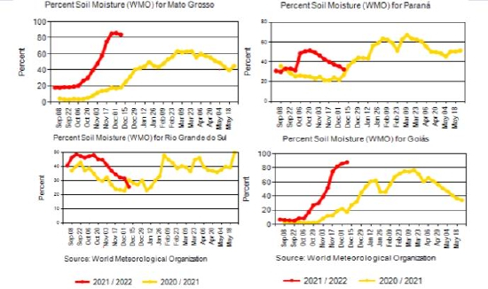 2021年度巴西大豆自种植以来,主产区天气良好,土壤墒情好于上年同期,截至2021年12月初,巴西大豆已基本完成全部播种,种植进度为近几年最快,较快的种植进度通常意味着良好的单产前景和收割期的提前。同时巴西大豆种植面积呈逐年稳增趋势,USDA预计21/22年度巴西大豆产量将再创历史新高达到1.44亿吨,同比增4.3%。预计巴西大豆最早于2021年12月下旬开始收割上市,这部分会与美国大豆出口窗口期重叠从而形成竞争。总之,目前看,新作巴西大豆丰产前景可期,使外盘美豆多方位承压。但拉尼娜背景下天气仍存不确定性,特别是巴西南部产区12月降雨量明显不足,若1月份持续偏干天气,产量或不及预期。