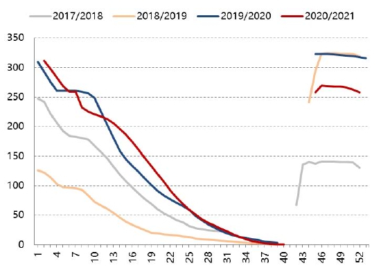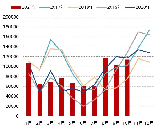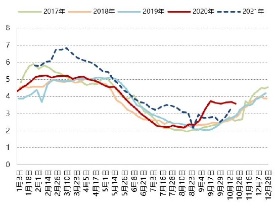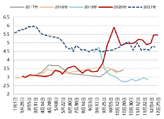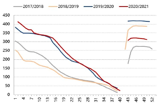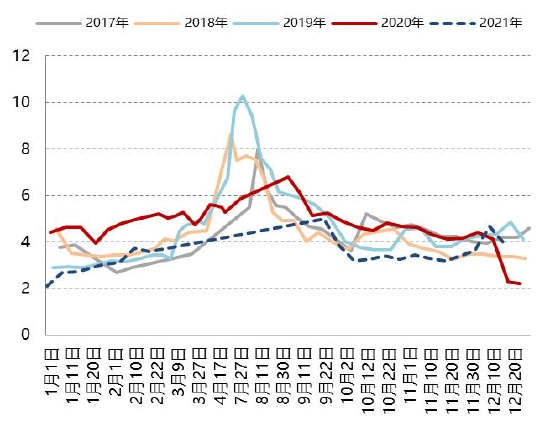 整体而言,受节日备货支撑,走货速度加快,高于往年同期。但目前冷库主要交易三四级货源,高价果需求偏弱。短期来看节日效应支撑当前价格,但惜售情绪不利于后期销售。关注节日消费表现,若不及预期、延续2020年偏弱需求,则苹果或会下跌。