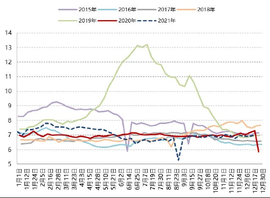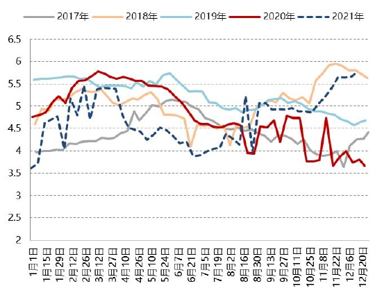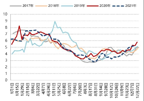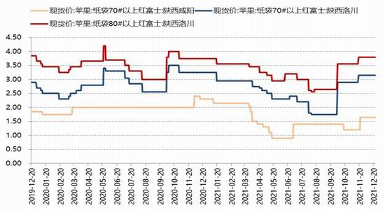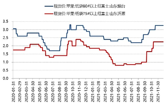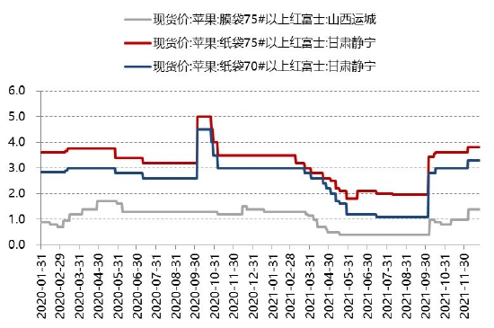 需求端方面,2021年由于春节与圣诞节、元旦节日的时间间隔较短,双节备货风险降低,客商节前备货体量明显高于2020年,节日效应提振需求,出货速度高于往年同期。出口方面,据海关总署公布的数据,2021年11月份我国鲜苹果出口12万吨,环比增加9%,出口表现良好。从季节性上来看,11、12月苹果的出口数量位于全年的相对高位,因此预计2021年或延续近两年的出口表现,出口增加在一定程度上会减少内部消化的压力。替代水果方面,12月份水果价格整体呈现上涨态势,农业农村部重点监测的7种水果平均批发价约6.18元/公斤,较月初上调0.12元/公斤,上涨较为明显。虽然水果价格居高有利于提振苹果消费需求,但近期市场柑橘类上市,量大价廉,或对苹果终端消费市场构成一定冲击。