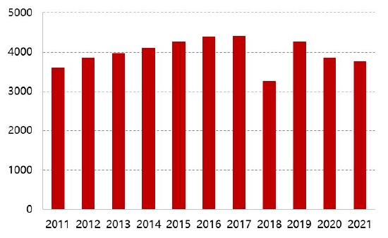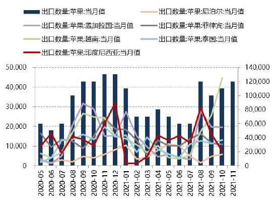 根据海关总署公布的数据,2021年11月份我国鲜苹果出口量约12万吨,环比增加9%左右,但处于往年历史相对较高位置,出口表现良好。我国鲜苹果主要出口孟加拉国、泰国等东南亚国家。我国鲜苹果胜在产量丰富,相对来说价格比较低廉,对出口形成了一定程度的利好支撑。从季节性上来看,11、12月苹果的出口数量位于全年的相对高位,因此预计2021年或延续近两年的出口表现。但我国鲜苹果出口规模仍然偏小,仅占总需求量的3%左右,只能说在一定程度上,出口表现良好会减轻内部消化的压力。