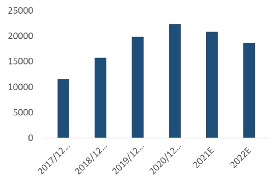 当前房地产政策回暖,信贷环境改善预期明显,但2022年中央将坚持“房住不炒”总基调不变,地产行业形成“三道红线+两道红线”的金融贷款调控格局,信贷大幅放松的可能性较小,同时房产税试点城市及征收细则即将发布,购房预期下降,房地产行业仍将持续弱势。因此我们预测,2022年房屋新开工面积将下降10.5%,约为181,584万平方米。作为开工周期的材料之一,2022年铝模板将带来-54.75万吨的铝的消费增量。2022年预测房屋竣工面积先高后低,增速放缓,同比上涨4个百分点。竣工周期用铝主要在铝门窗板块,假设房屋窗地比为0.22,目前正在普及的断桥隔热系统门窗每平方米的耗铝量为10-12kg,据此数据预测2022年铝门窗板块将带来8.62-10.34万吨铝的消费增量。据此,2022年地产板块将带来-45.27万吨的铝消费增量。
