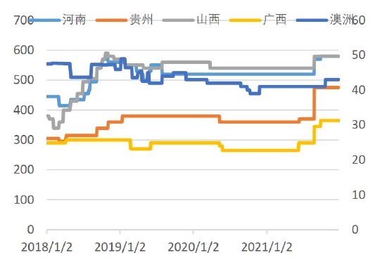 2022年原料端供应影响不大,电改之后高能耗品种价格重心将普遍上移,同时我们对其他辅料价格区间进行测算,以确定电解铝成本下限,并作为2022年铝价运行区间下限的参考。
