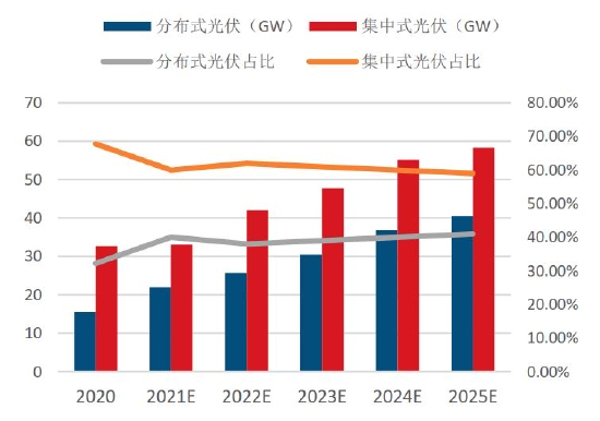 图51:我国分布式及集中式光伏年度新增装机规模预测