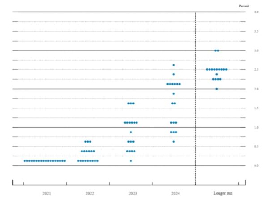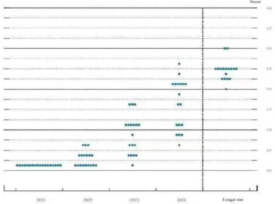 2021年12月的议息会议上将把每月对美国国债和抵押贷款支持证券(MBS)的购买规模减少300亿美元,幅度是之前的两倍,按此推算该资产购买计划料于2022年年初结束,而不是最初计划的年中。与政策声明同时发布的点阵图显示,从预估中值看,美联储官员认为2022年进行三次幅度25个基点的加息将是合适的。新预测还显示,美联储认为2023年也可以加息三次,2024年加息两次,到2024年末联邦基金利率将达到2.1%。