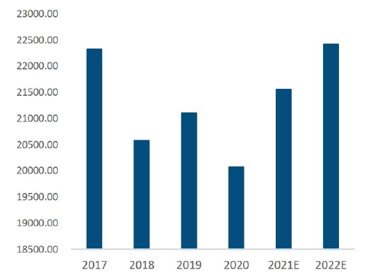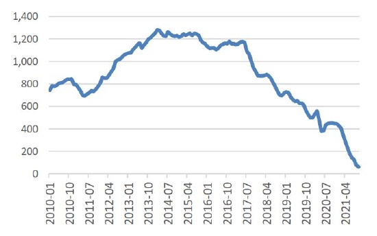 目前美国消费结构占比中40%应用于交通,其中主要用来生产汽车。2021年,美国汽车库存水平持续下滑,1-10月汽车库存为226.68万辆,同比下降50.84%,处于近十年库存水平最低值,远低于疫情之前的水平,存在较强的补库需求。同时欧洲发达国家城市化进程与美国相差无几,其铝的主要消费领域亦集中在交通领域。2021年欧洲地区汽车产量受缺芯影响亦下降明显,2022年汽车行业同样有补库需求。日本方面,2021年1-8月,汽车总库存为116.29万辆,其中,8月份汽车库存为10.99万辆,同比下降16%。市场预计汽车缺芯问题将在2022年2季度得到缓解,届时海外有强劲的补库需求进而带动铝消费。