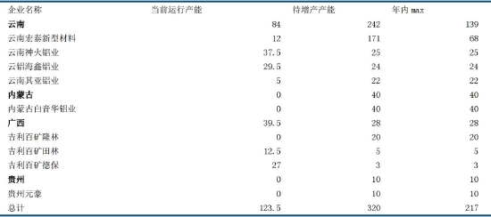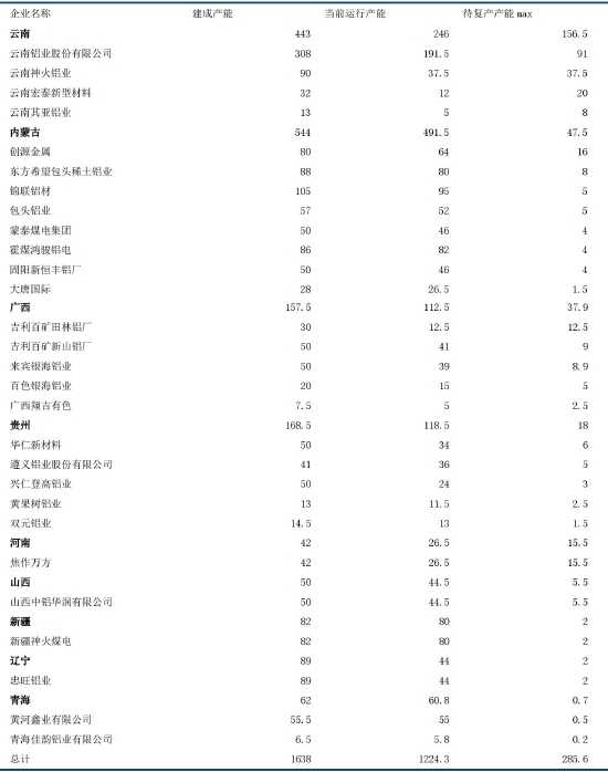 云南待复产产能156.5万吨,其中能耗双控限产50万吨。内蒙待复产产能47.5,其中能耗双控限产产能40万吨左右。山西能耗双控限产5.5万吨,贵州能耗双控影响产能10万吨左右。2021年能耗双控实际影响产能在105.5万吨左右,其余可复产产能在180.1万吨左右。在考虑能耗双控标准微调,及新增绿能替代部分能耗的情况下预估2022年的能耗双控影响产能:按能耗强度下降0.02吨标准煤/万元测算,则降幅在0.02/0.78*100%=2.56%,则2022年能耗双控影响产能在105.5*(1-2.56%)=102万吨左右,再考虑新增新能源部分降低能耗强度12%,预估2022年实际影响产能在102*(1-12%)=89.8万吨左右,则实际可复产产能为285.6-89.8=195.8万吨。