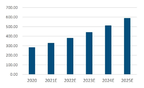 城市轨道交通方面,2021-2025年城轨交通运营增速下降,因此运营车辆需求量随之下降。2021年城轨车辆较2020年相比,减少3500辆,用铝需求量下滑30万吨;根据中国城市轨道交通协会的预测,2022年预计城轨交通运营车辆将有1500辆的新增,从而将带来12万吨的用铝新增需求量。