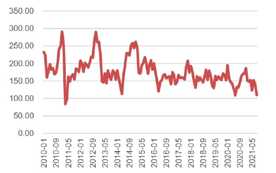 2021年1-10月,房屋新开工面积为182,819万平方米,同比下降9.1%;房屋竣工面积为68,753.82万平方米,同比增加16.2%。从开工增速和竣工增速来看,数据表明二者之间或许存在两年左右的滞后期。2021年,受到房地产行业降杠杆及房地产企业的权益拿地金额占权益销售比重不超过40%的影响,行业开工受到限制,同时由于房产税试点政策落地和行业信用风险上升,地产销售走弱,从而开工意愿较低,因此2021年整体房屋新开工面积预计将下降9.6%。另外,在“三道红线”政策约束下,房地产企业不断加快存量项目竣工,以此加快利润结转从而达到降杠杆的目的,因此2021年房地产竣工增速明显提升,实现了近五年以来的最大上涨,预计将达到7.4%的同比增长率。
