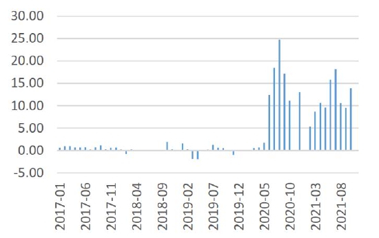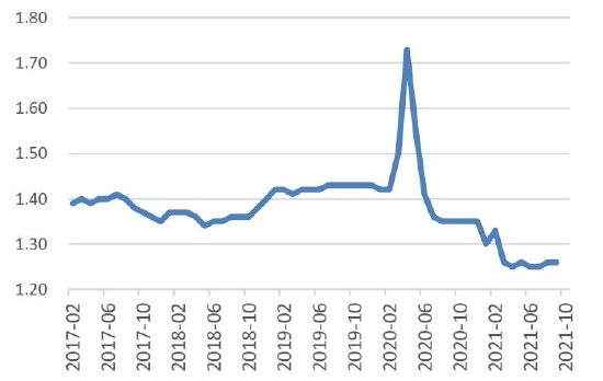 我们认为2022年海外消费表现将强于国内,2021年10月,美国家具及家具摆设、汽车及汽车零件和用品、机械设备和用品的批发商库存销售比分别为1.49%、1.62%及2.33%,整体贸易库存销售比为1.26%,低于新冠疫情爆发前1.39%的平均值。从美国的贸易库存销售比来看,美国商品存在一定的补库需求。