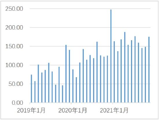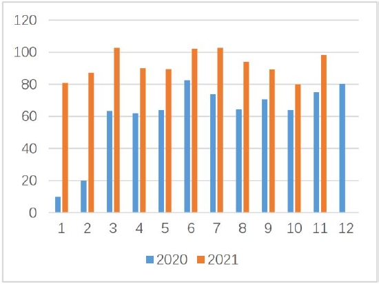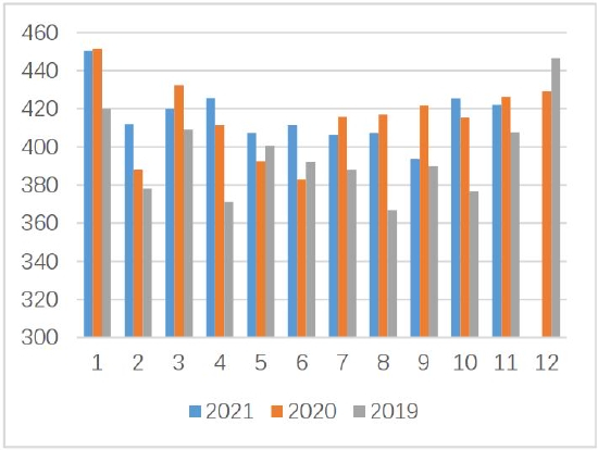 中国市场,低硫燃料油国产进一步放量,2021年月度产量稳定在80万吨以上,全年产量有望超过1100万吨,同比2020年增加400万吨左右。其中中石化产量占比接近60%,中石油产量占比33%,中海油产量占比7%,其他有配额的炼厂产量较少。随着国内产量的增加,中国加注市场的竞争力不断走强,舟山市场低硫加注价格在2021年较长时间内低于新加坡价格。2021年燃料油月度保税出口量在150万吨左右,1-11月累计保税出口量达到1780万吨,同比增加480万吨,全年保税出口量预计超过1900万吨。
