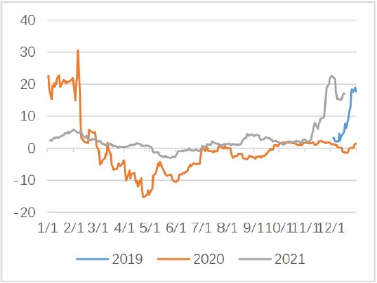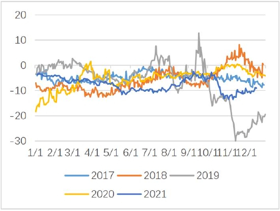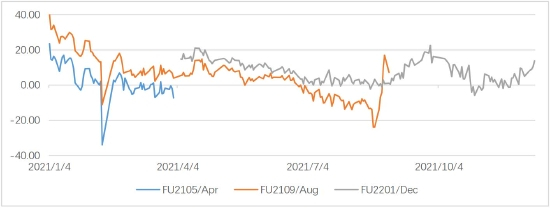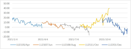内外价差方面,2021年内盘FU和LU内外价差整体区间内窄幅震荡。FU由于国内现货市场消化能力有限,主力合约临近交割时往往给出较大贴水。LU内外价差区间相对更窄,主要因为国产货源的释放,进口利润多数时间压缩在低位。10月份前后,由于国内柴油资源偏紧,叠加低硫的第三批出口配额迟迟没有下放,内盘LU给出较高的升水。12月份,新加坡低硫资源紧缺,现货贴水站上历史高位,内外盘价差大幅走低,期间陆续有2船低硫套利船货从中国市场发往新加坡,实现了复出口。