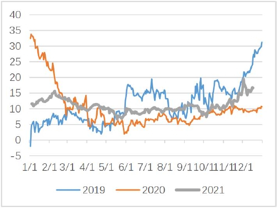 高低硫价差:更像是两个单边。新加坡高低硫价差(HI-5)从2020年4季度50美金/吨反弹至2021年年初100美金,此后在100美金以上水平运行。从全年来看,高低硫价差并没有明显的回归属性,更多是某个品种单边行情带来的驱动。年初低硫走强时,HI-5冲上阶段性高位130美金以上,随后逐渐回落至100美金附近。整个2季度HI-5震荡走强了20美金,3,4季度高硫和低硫先后出现了一波独立行情,HI-5被压缩至75美金后在年底大幅冲高至180美金以上。