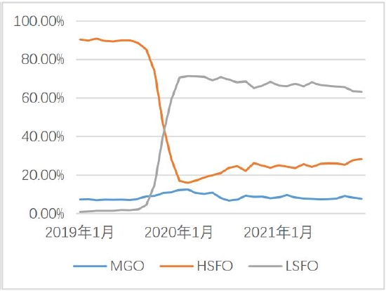 新加坡市场2020年全年加注量达到4983万吨,同比增幅5%。疫情的影响在2020年下半年得到明显修复,且2019年因经济下行,海运消费基数偏低。2021年1-11月新加坡加注量4581万吨,同比基本持平。海运需求延续了疫情后期的旺盛,但高油价对终端造成了一定的负反馈,全年加注量同比预计持平。分品种消费上,21年高硫加注量占比大幅抬升,从年初的25%左右逐渐上升至28%以上,全年消费占比约为25.6%,而2020年全年只有21%,这与2021年高低硫价差长期在100美金以上运行有着较为密切的关系。