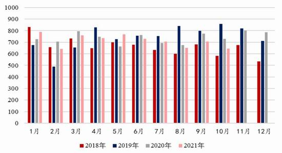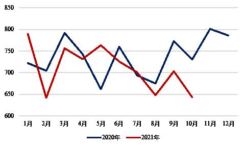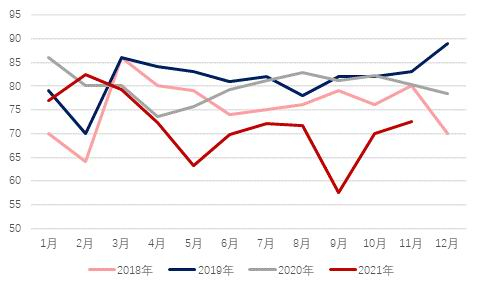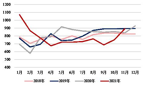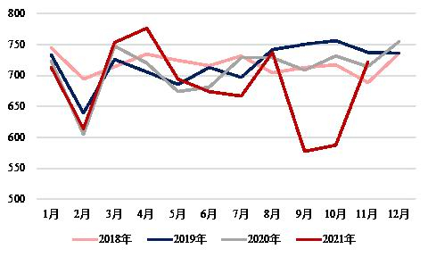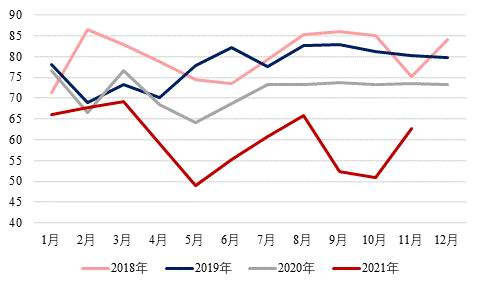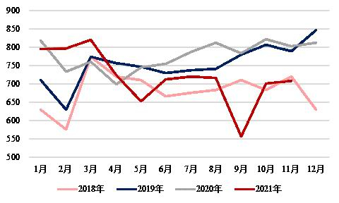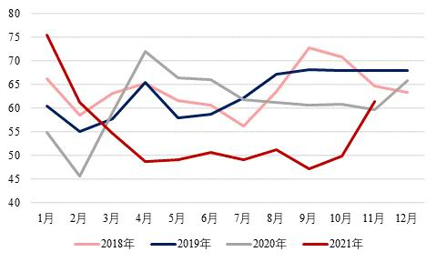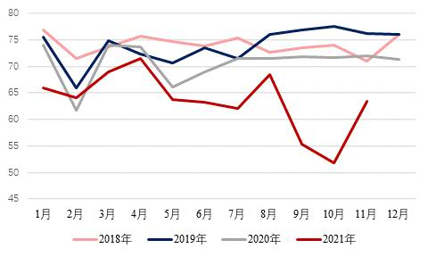 2021年,受能耗双控,限电,环保,“双减”政策,疫情反复等多种因素的影响,下游纸企开工率与往年同期相比处于低位。针叶浆表观消费量也几乎都低于2020年同期。1-11月份,双铜纸平均开工率不足60%,比2020年同期低11%左右;双胶纸平均开工率约63.47%,比2020年同期低7%左右;生活用纸平均开工率为54.4%,比2020年同期低6%左右;白卡纸平均开工率为71.58%,比2020年同期低9%左右。2021年终端需求比较疲软,呈现“旺季不旺”的局面。