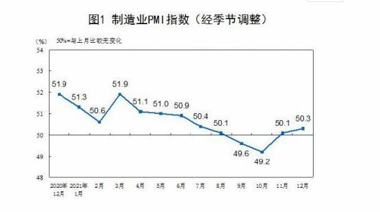 中新网2021年12月31日电据国家统计局网站消息,12月份,中国制造业采购经理指数(PMI)为50.3%,比11月上升0.2个百分点,高于临界点,制造业景气水平继续回升。