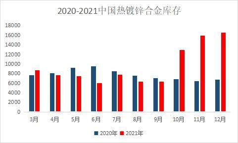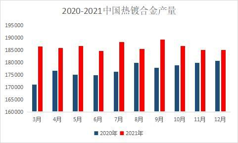 第二第三季度,伴随强有力的疫情防控政策,经济复苏,消费复苏,企业正常生产,热镀锌合金生产处于全年旺期,冶炼端产量持续提升,进口大幅增加,消费端来看,热镀锌合金开工率好于2020年,基本与2019年持平。库存方面,海外库存因交仓绝对量大幅提升,国内库存与年初基本持平,处于全年的历史低位。加之国家三次抛储,一定程度上降低合金厂的生产成本。但由于国内钢材消费不及市场预期,海外产销出现明显下滑,以及海运费价格上涨,热镀锌钢板出口量相比以往有所下滑。但从整体上看,2021年热镀合金产量三四季度产量明显高于2020年。据我的有色网统计,2021年三四季度的产量较2020年增长5%。